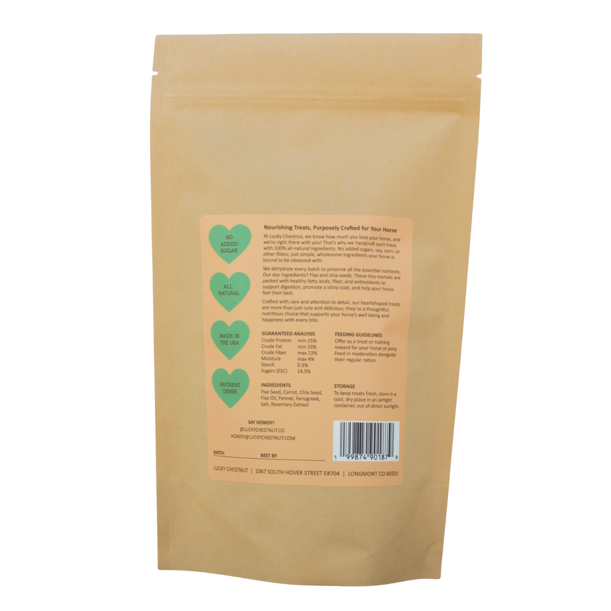 What else should you know? Our recipe is completely free of added sugar, corn, soy, grains, or fillers. We dehydrate (instead of bake!) to preserve those amazing plant nutrients. Whether you're looking for a smart, daily reward or just need a treat for the biggest pocket-sniffers on the farm, this fan-favorite blend has you covered.