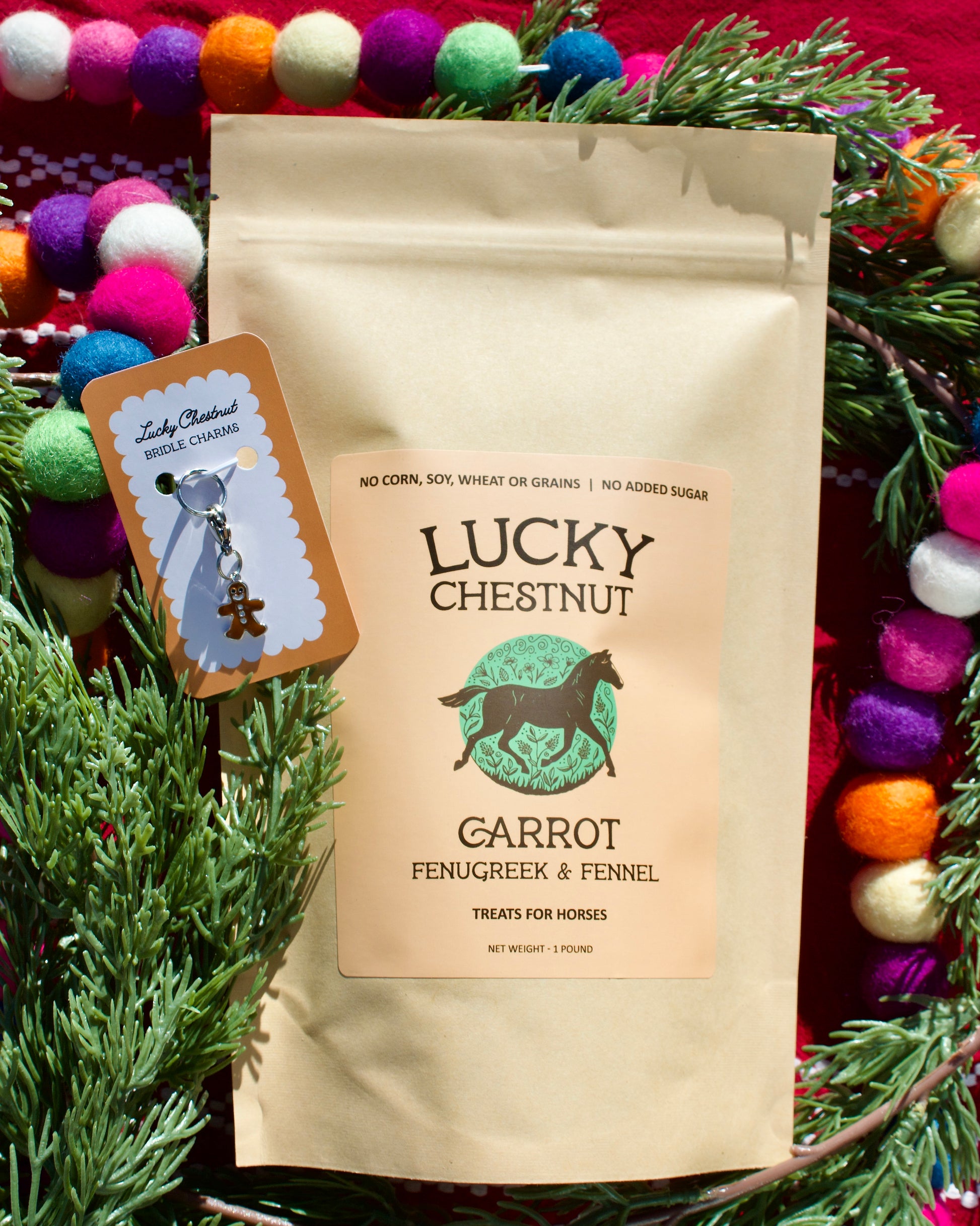It includes a 1 lb bag in the flavor of your choice and an exclusive gingerbread bridle or halter charm for a little seasonal sparkle.